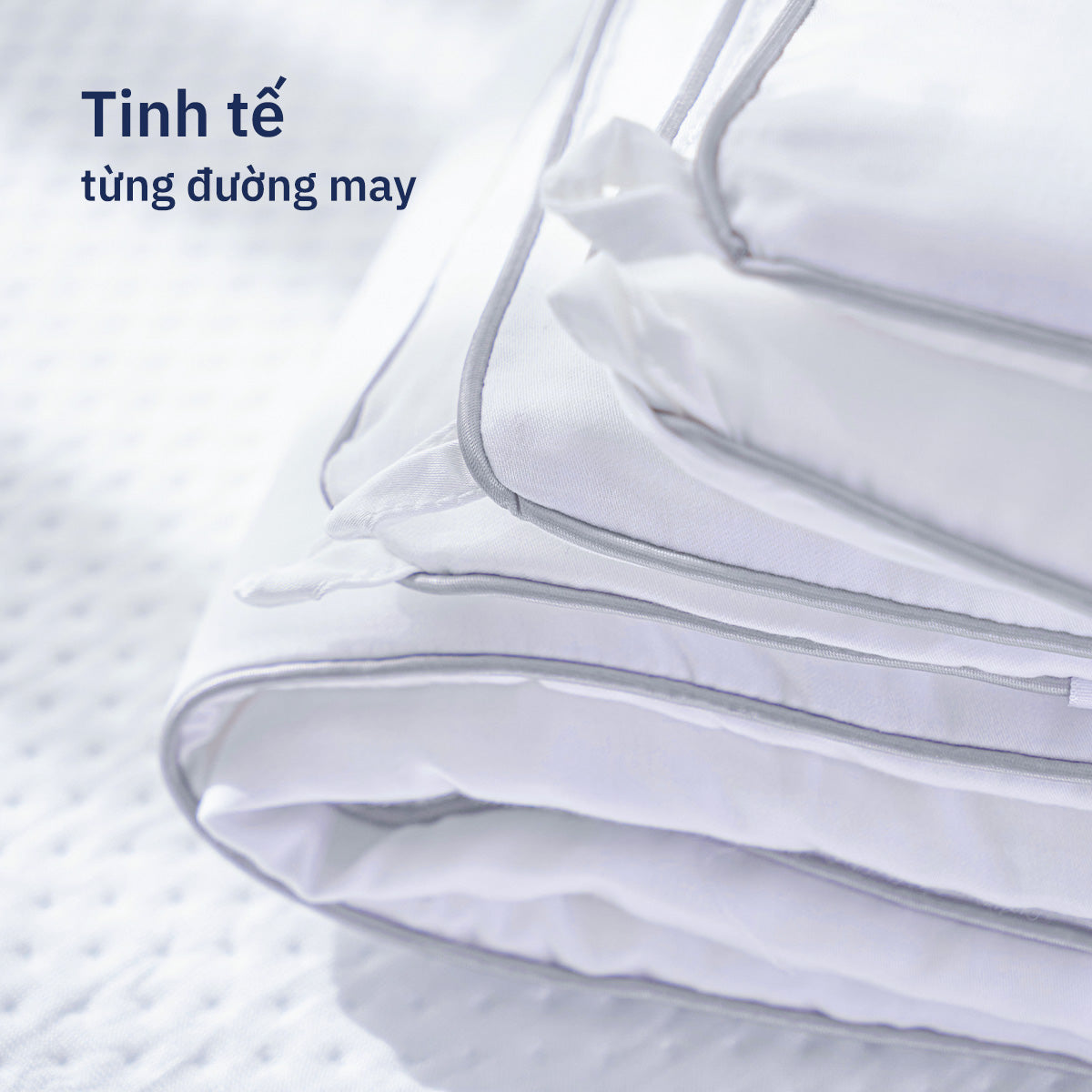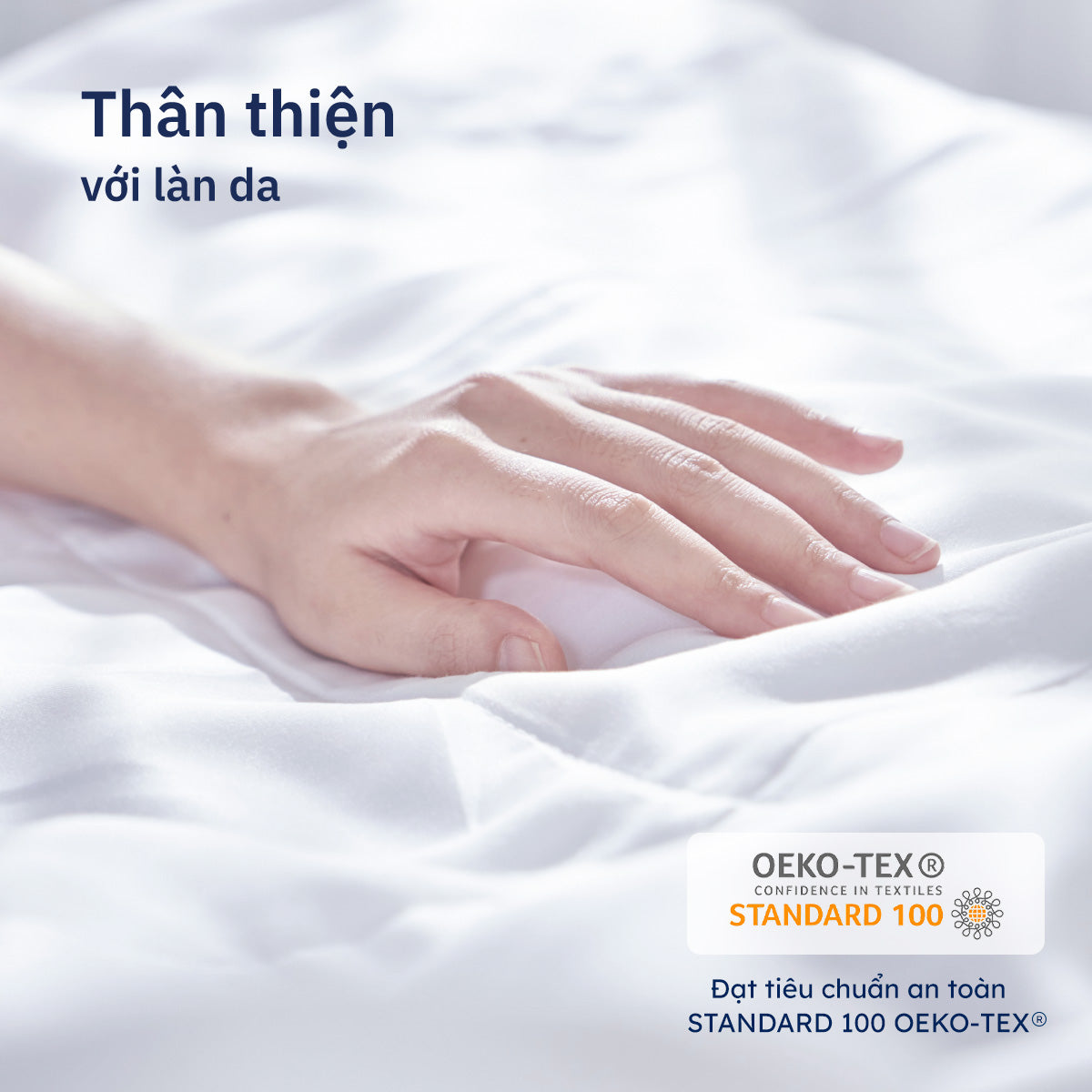 Bạn có thể hoàn toàn yên tâm vì chăn Bạch Đàn Ru9 được làm từ 100% sợi bạch đàn thiên nhiên, đạt chứng nhận quốc tế STANDARD 100 OEKO-TEX® an toàn tuyệt đối, kể cả cho trẻ nhỏ. Nhờ cấu trúc sợi siêu thoáng khí và khả năng hút ẩm vượt trội, chăn mang đến cảm giác mát mẻ, dễ chịu hơn so với cotton thông thường, đồng thời kháng khuẩn và không gây dị ứng. Đặc biệt, công nghệ sản xuất hiện đại giúp chăn tự điều hòa nhiệt độ, giữ ấm vừa đủ vào mùa đông và mát lành vào mùa hè, tạo nên sự cân bằng hoàn hảo cho giấc ngủ trọn vẹn suốt bốn mùa.