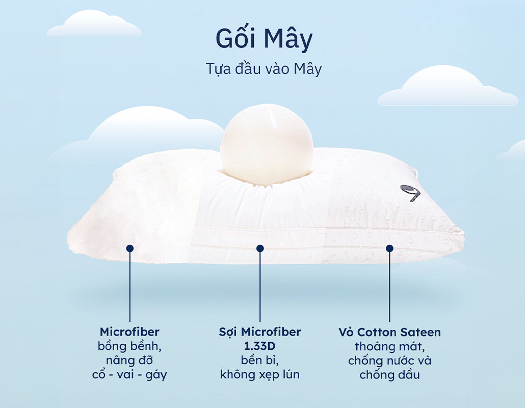 Bạn hoàn toàn có thể yên tâm về độ an toàn của gối Mây. Gối được làm từ sự pha trộn chuẩn xác giữa hai dòng sợi Microfiber 1.33D Premium và Microfiber 3D. Nhờ chất liệu tiên tiến này, gối có cấu trúc bông vững chắc và bền bỉ, giúp hạn chế tình trạng tích tụ ẩm mốc và rơi bụi bông như các loại gối thông thường trên thị trường.