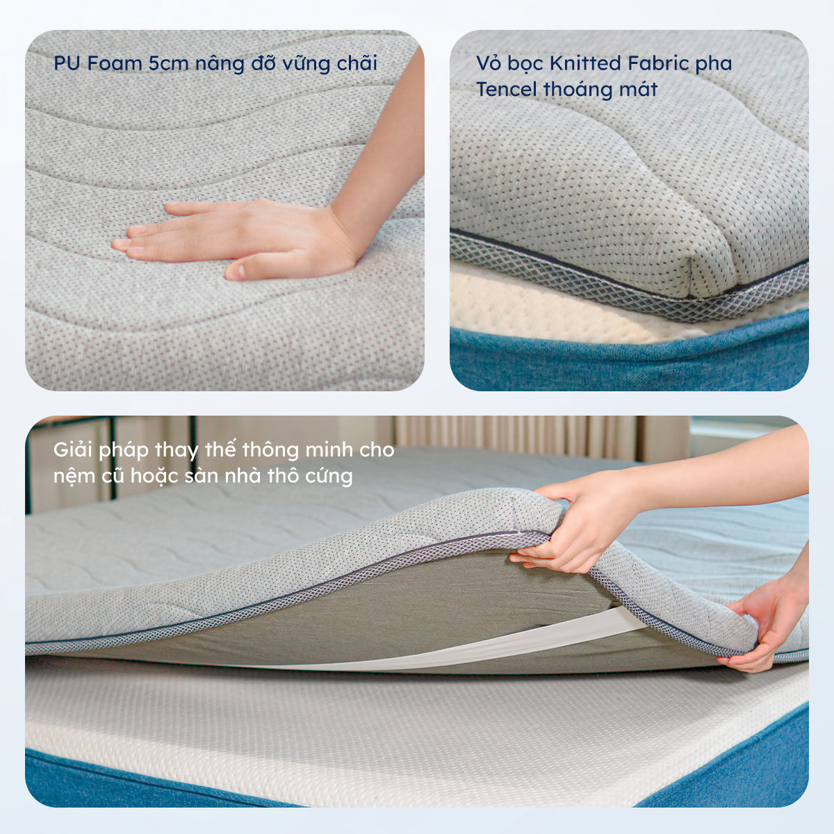 Cả hai dòng nệm đều được Ru9 thiết kế với chiều cao 5cm tiện lợi, nhưng có sự khác biệt rõ rệt về cấu trúc và cảm giác nằm, giúp bạn dễ dàng lựa chọn sản phẩm phù hợp. Nệm Foam Topper Mate chỉ có 1 lớp duy nhất là PU Foam, mang lại cảm giác nâng đỡ chắc chắn và ổn định hơn, giúp giảm áp lực tại các điểm tỳ nén thường gặp như vai, lưng và hông. Trong khi đó, Nệm Foam Topper sở hữu cấu trúc 2 lớp với sự kết hợp của Memory Foam và PU Foam, sự kết hợp này tạo nên sự cân bằng giữa nâng đỡ và êm ái.