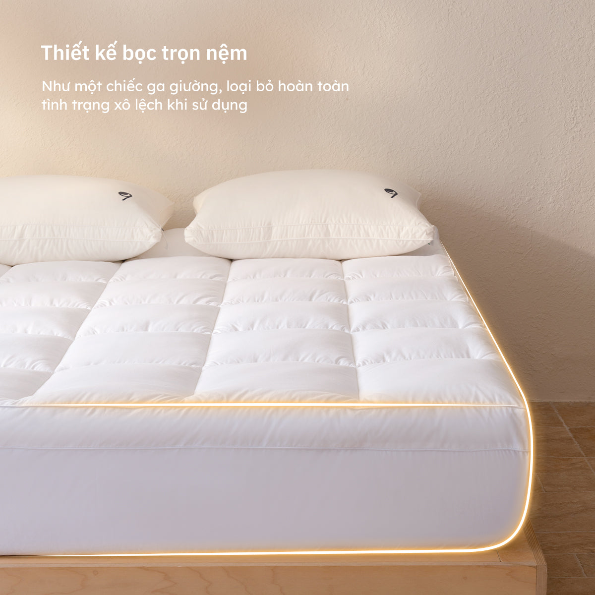 Bạn hoàn toàn có thể yên tâm. Thiết kế bọc nguyên nệm được tạo ra để tối ưu sự tiện lợi khi sử dụng. Bạn chỉ cần lồng Topper Mây vào nệm như một chiếc ga bọc, thao tác nhanh chóng và đơn giản. Khi đã cố định, topper sẽ ôm trọn bề mặt nệm, loại bỏ hoàn toàn tình trạng xô lệch khi trở mình, vừa giữ giường gọn gàng, vừa đảm bảo cảm giác ổn định và thoải mái suốt đêm.