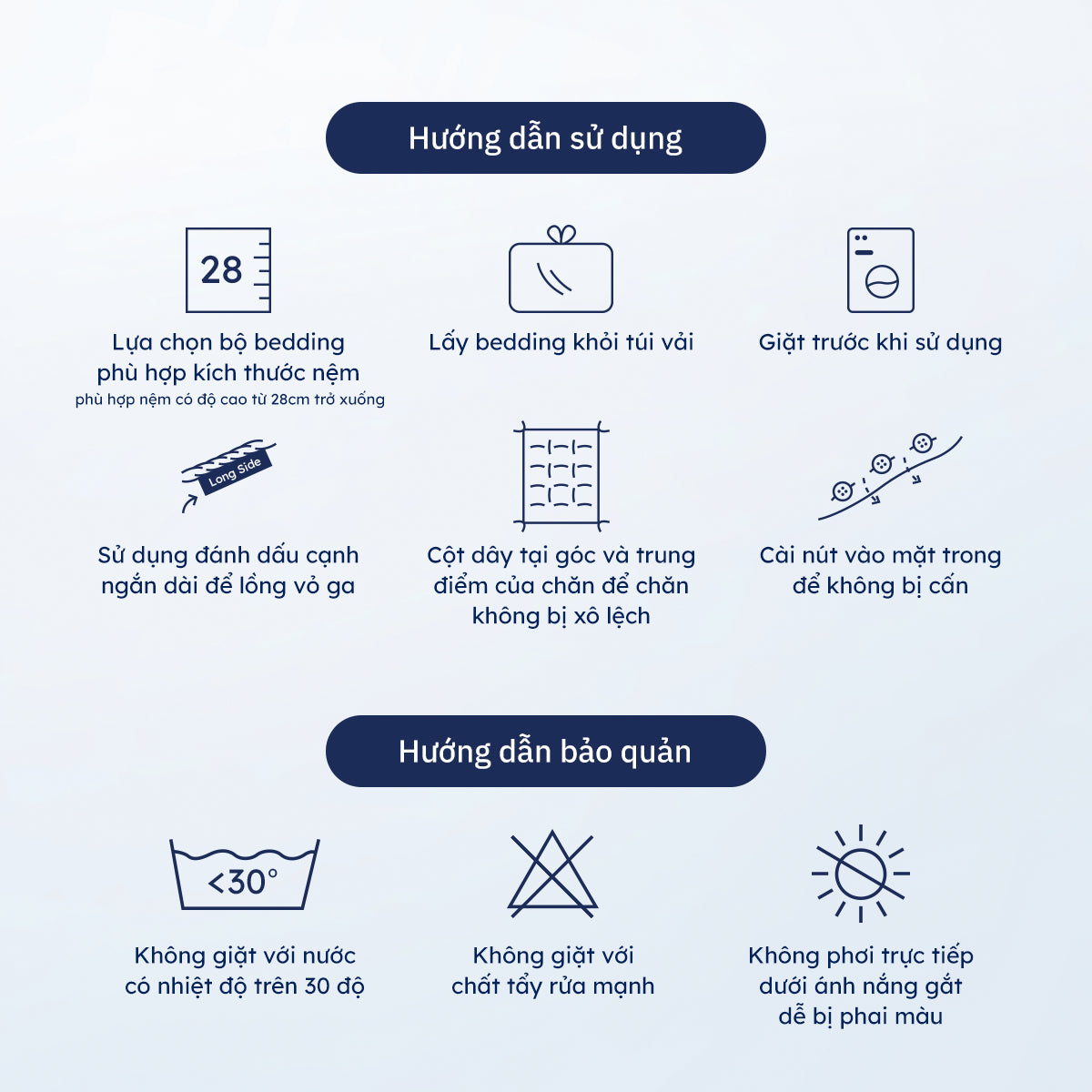 Do được làm từ chất liệu 100% tự nhiên, việc chăm sóc đúng cách sẽ giúp sản phẩm đồng hành cùng bạn lâu hơn. Bạn có thể tham khảo một vài mẹo sau: - Giặt bằng máy ở chế độ nhẹ với nước lạnh, không giặt quá 30 phút. - Không dùng bột giặt cho lần giặt đầu tiên và tránh các chất tẩy rửa mạnh. - Phơi ở nơi râm mát, tránh ánh nắng trực tiếp hoặc sấy ở nhiệt độ thấp. - Không giặt chung với các sản phẩm khác. Chỉ với những lưu ý đơn giản này, bạn đã có thể giữ cho bộ Bedding Ru9 luôn bền đẹp và êm ái, mang lại những giấc ngủ ngon trọn vẹn.