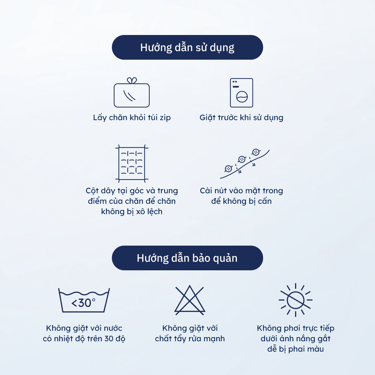 Do được làm từ chất liệu 100% tự nhiên, việc chăm sóc đúng cách sẽ giúp sản phẩm đồng hành cùng bạn lâu hơn. Bạn có thể tham khảo một vài mẹo sau: - Giặt bằng máy ở chế độ nhẹ với nước lạnh, không giặt quá 30 phút. - Không dùng bột giặt cho lần giặt đầu tiên và tránh các chất tẩy rửa mạnh. - Phơi ở nơi râm mát, tránh ánh nắng trực tiếp hoặc sấy ở nhiệt độ thấp. - Không giặt chung với các sản phẩm khác. Chỉ với những lưu ý đơn giản này, bạn đã có thể giữ cho bộ Bedding Ru9 luôn bền đẹp và êm ái, mang lại những giấc ngủ ngon trọn vẹn.