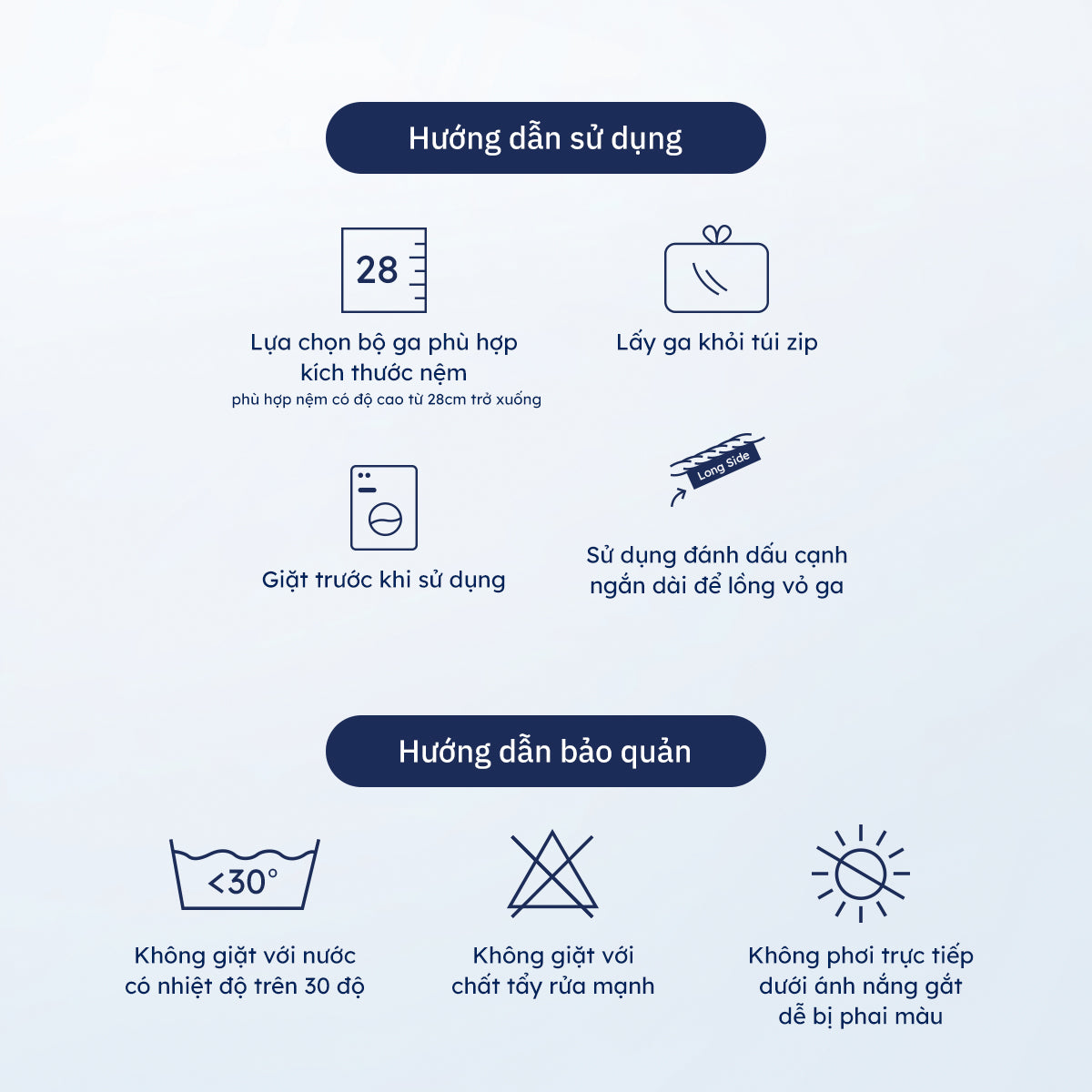 Vỏ ga đệm Cotton Sateen nên được giặt theo hướng dẫn từ nhà sản xuất để duy trì tính năng và độ bền của vải. Tránh sử dụng chất tẩy mạnh để không làm mất đi tính mềm mịn của sợi cotton.